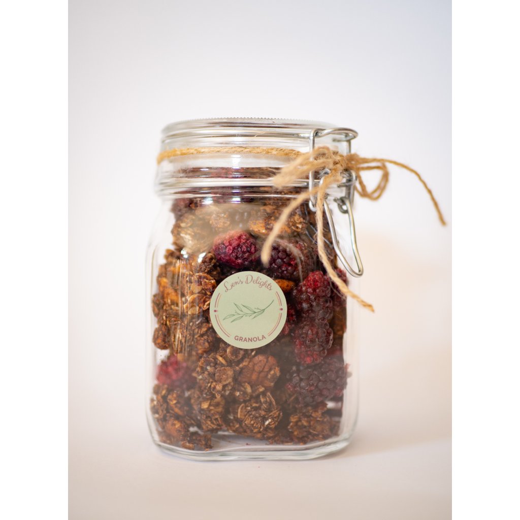 | Složení: | bezlepkové ovesné vločky, mandle, kešu ořechy, strouhaný kokos, bio datlový sirup, bio jablečné pyré, extrakt z vanilky, čerstvá citronová kůra, himalájská sůl, lyofilizované maliny |