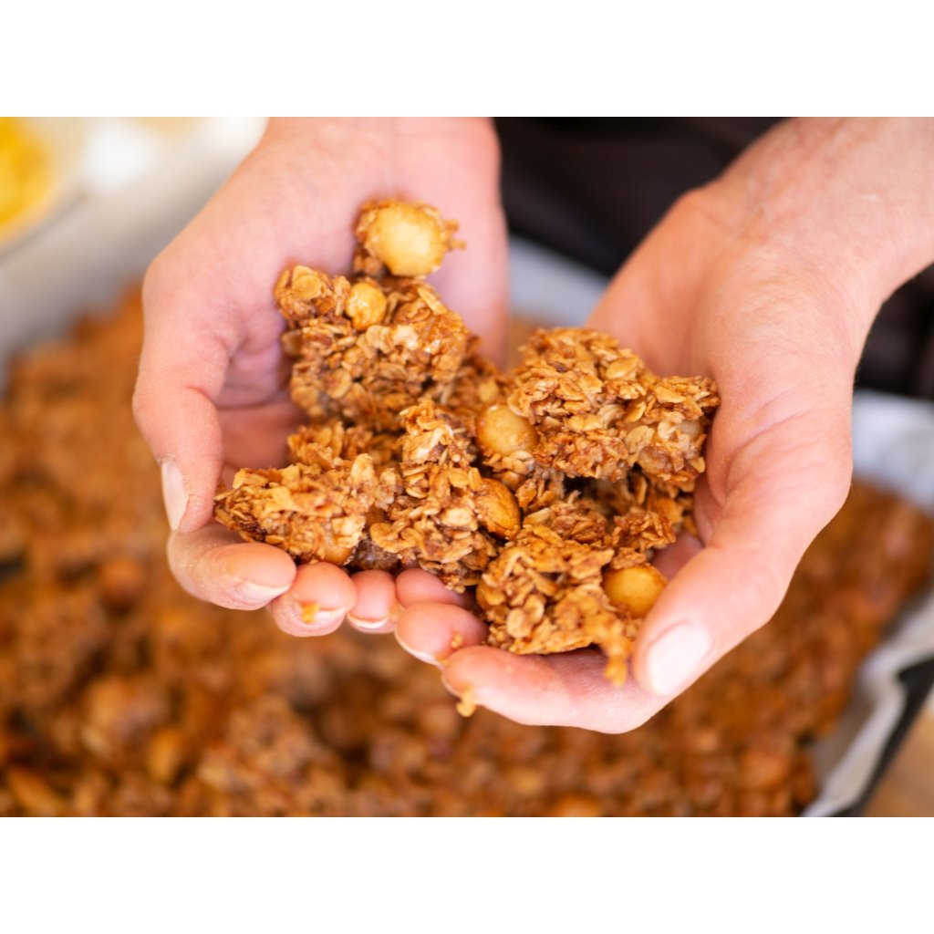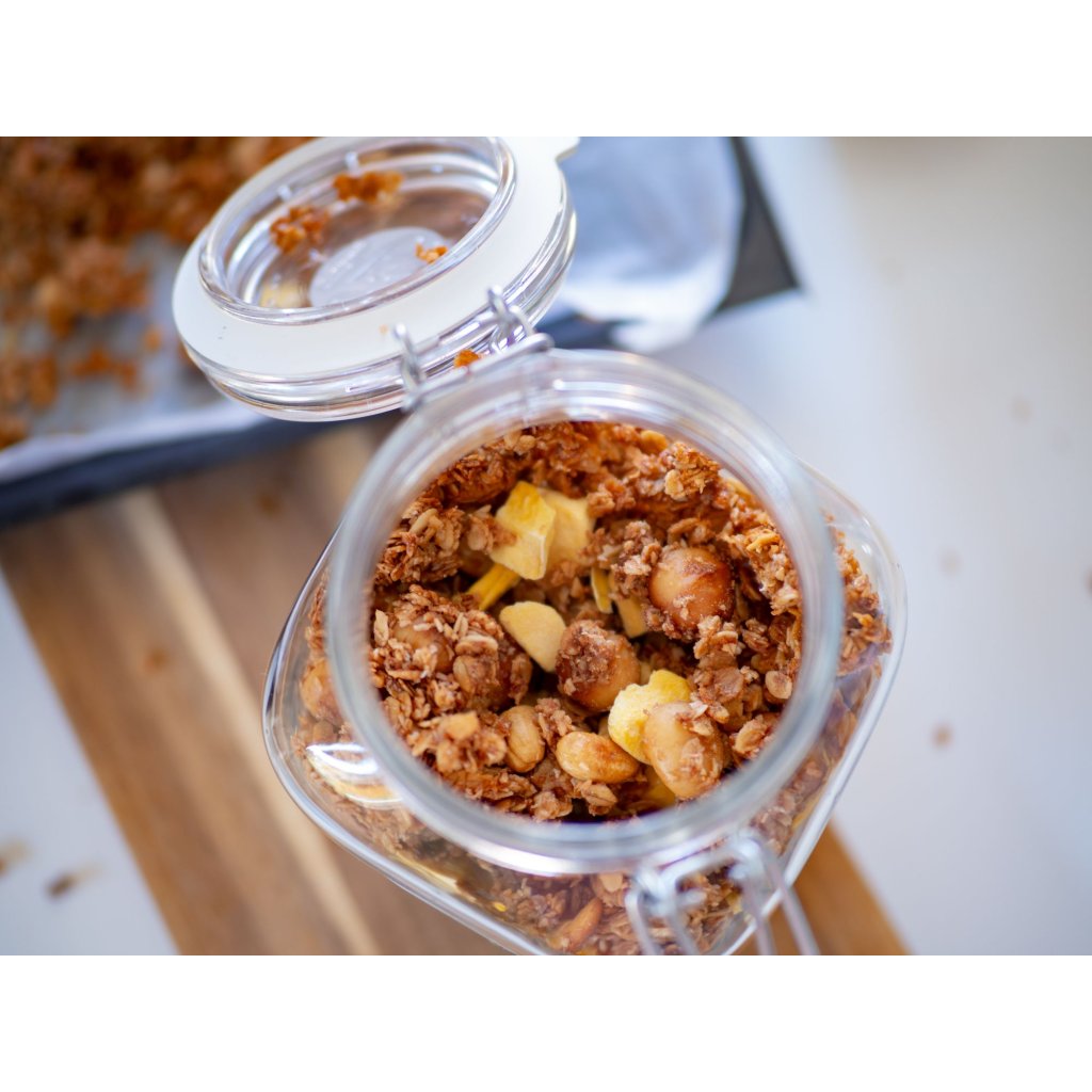 | Složení: | bezlepkové ovesné vločky, mandle, kešu ořechy, strouhaný kokos, bio datlový sirup, bio jablečné pyré, extrakt z vanilky, čerstvá citronová kůra, himalájská sůl, lyofilizované mango |