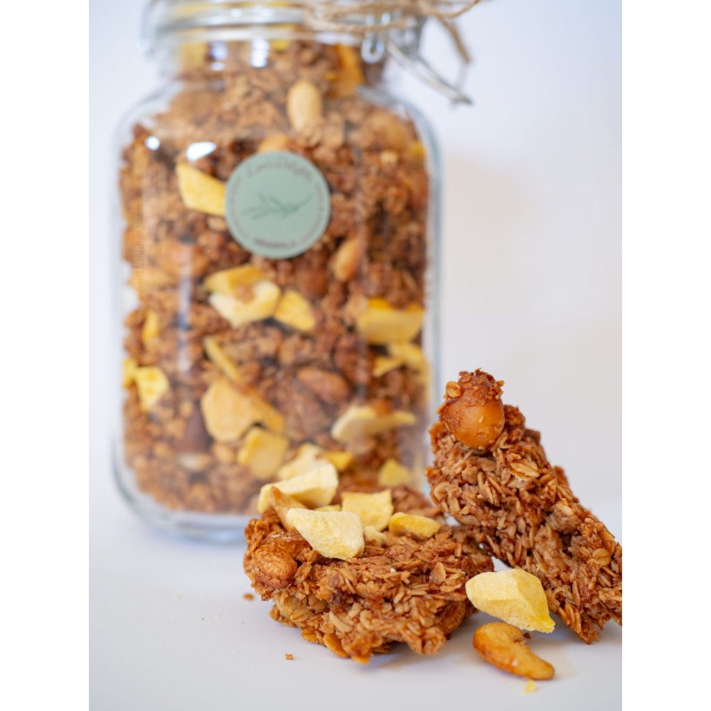Letní svěžest v každém soustu! Tato bezlepková granola kombinuje jemně pečené vločky s lyofilizovaným mangem a citrusovým aroma pro osvěžující zážitek.